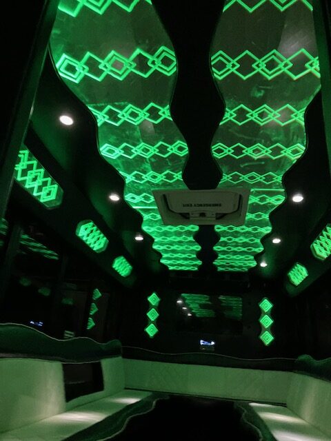 20 – 22 passenger Luxury Limo Bus Luxury interior; hardwood floors, leather seating, flat screen tvs, neon, fiber-optics, mirrored twinkle-star ceiling, and bars with ice chest